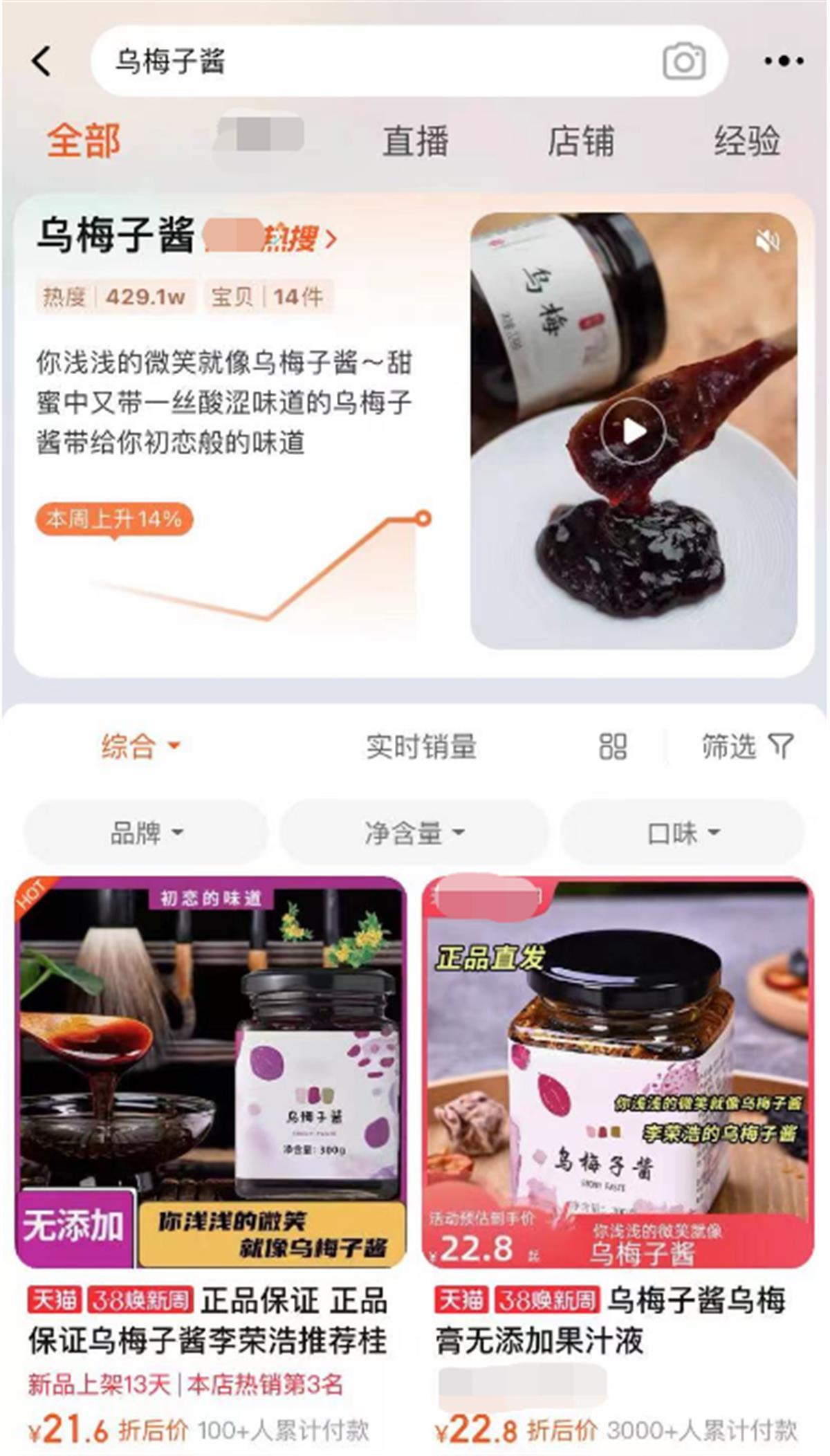 近日,歌曲《乌梅子酱》走红短视频平台,同名商品在电商平台的销量也持续飘红,某电商平台对“乌梅子酱”的搜索量近期增长了200倍,不少网友下单留言“已下单同款,想感受一下甜甜的爱情!”