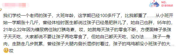 还有网友称,自己学校有位老师很胖,年纪轻轻就得了糖尿病,她的孩子也被诊断为肥胖儿,但这位老师仍旧不加以克制,给自己和孩子买零食,导致孩子一身肉,走几步就累,生殖器官发育不良。