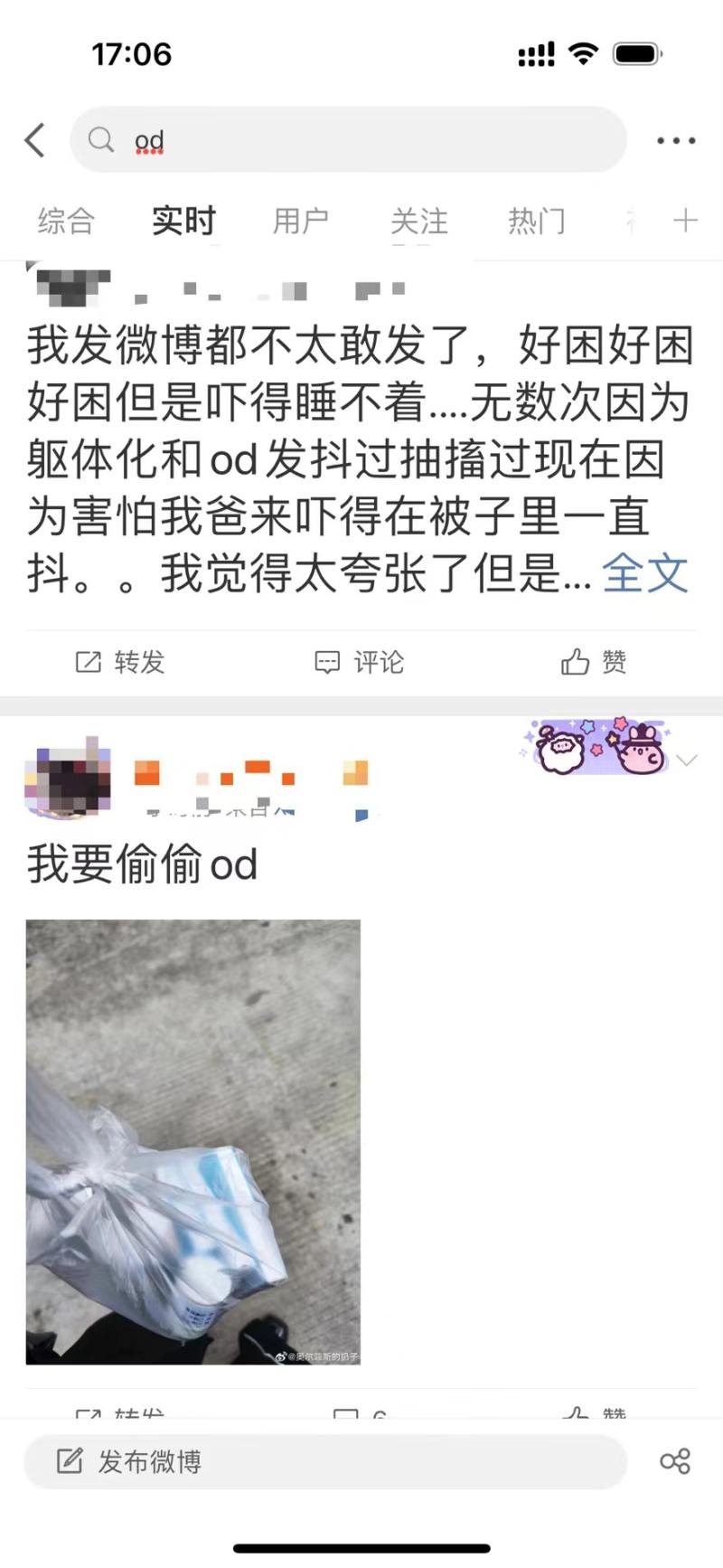 在网络上,过量用药的行为被称为od(overdose),无论是微博、贴吧还是新兴的抖音、快手,搜索相应的关键字,都能看到有人发布用药感受、用药经验,寻求同类,发泄痛苦。因为大部分用户为女性,所以od群体也常被称为od妹。