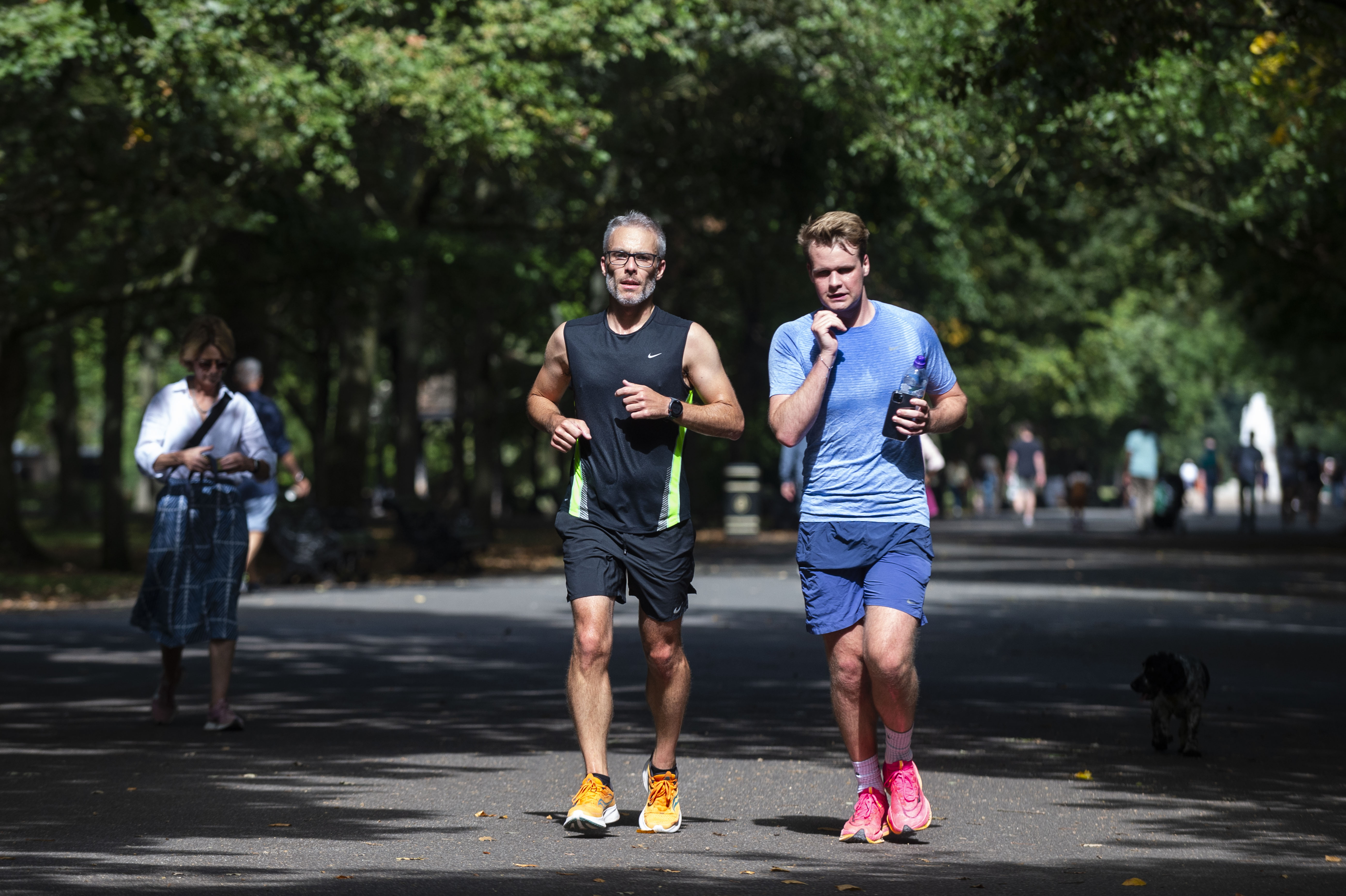 2023年9月6日,两名男子在英国伦敦摄政公园内慢跑。新华社发(史蒂芬·程摄)