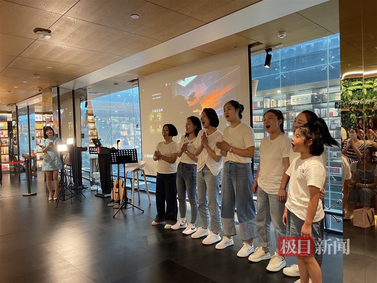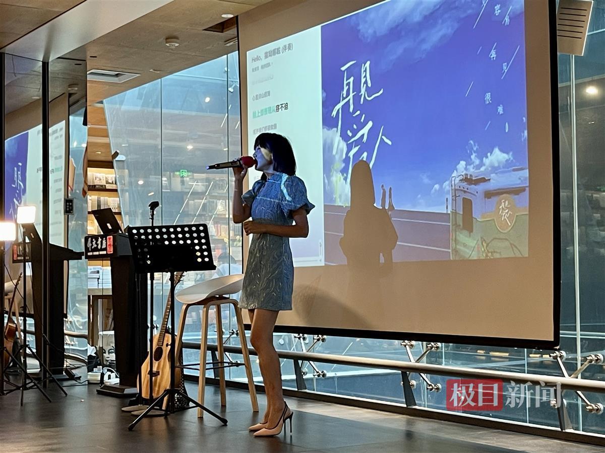 8月20日,湖北省外文书店“夏日限定音乐季”再启动朱雅琼经典英文歌曲弹唱会。六十多名读者,惬意坐在外文书店四楼人文书苑的木质阶梯上,与歌手朱雅琼一起,徜徉音乐宇宙。当天,朱雅琼一袭淡蓝色旗袍短裙亮相,怀抱吉他的她,以一首《Fly me to the moon》拉开弹唱会的帷幕。“音乐就是很奇妙,没有语言的限制。”