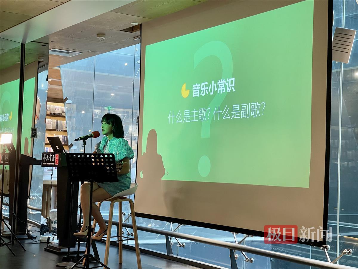 除了带来经典英文歌曲及原创曲目,朱雅琼还贴心地为前来聆听弹唱会的外文书店读者介绍了音乐小知识及发声基本技巧,现场教唱英文歌曲《Que Sera》,让大家在活动中不仅享受音乐,也参与音乐。