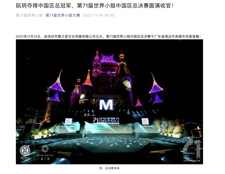 天目新闻记者注意到,微信公众号“第71届世界小姐大赛”的文章显示,2021年11月13日,第71届世界小姐中国区总决赛于广东省清远市英德市落幕,毕业于英属哥伦比亚大学的阮玥夺得了本届中国区总冠军。