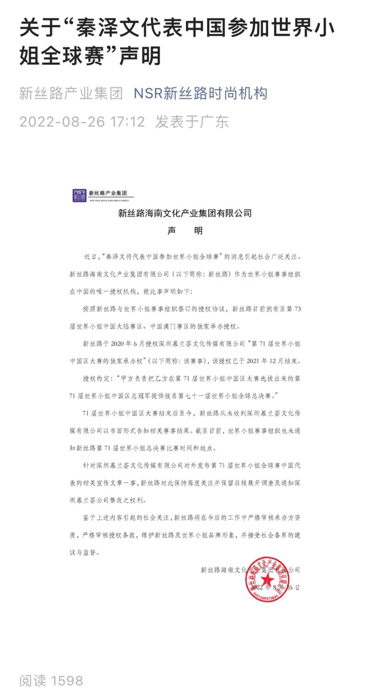名为“NSR新丝路时尚机构”的微信公众号发布声明称,新丝路海南文化产业集团有限公司(下称“新丝路”)是世界小姐赛事组织在中国的唯一授权机构。71届世界小姐中国区大赛结束后至今,新丝路从未收到深圳慕兰荟文化传媒有限公司(下称“慕兰荟”)以书面形式告知相关赛事结果。