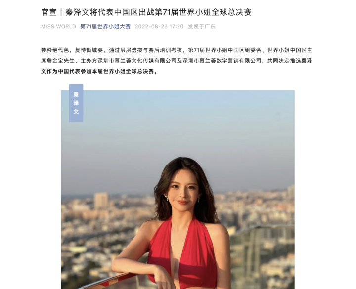 8月23日,该公众号官宣,通过层层选拔与赛后培训考核,第71届世界小姐中国区组委会、世界小姐中国区主席詹金宝、主办方慕兰荟及深圳市慕兰荟数字营销有限公司,共同决定推选秦泽文作为中国代表参加本届世界小姐全球总决赛。