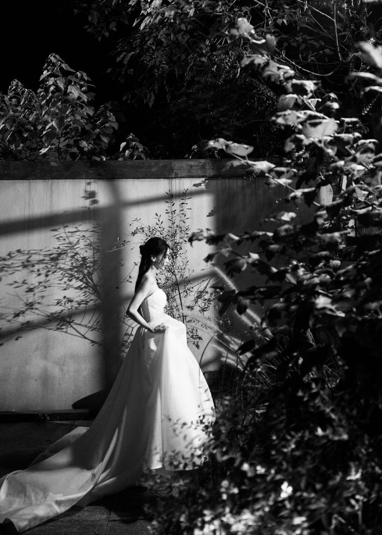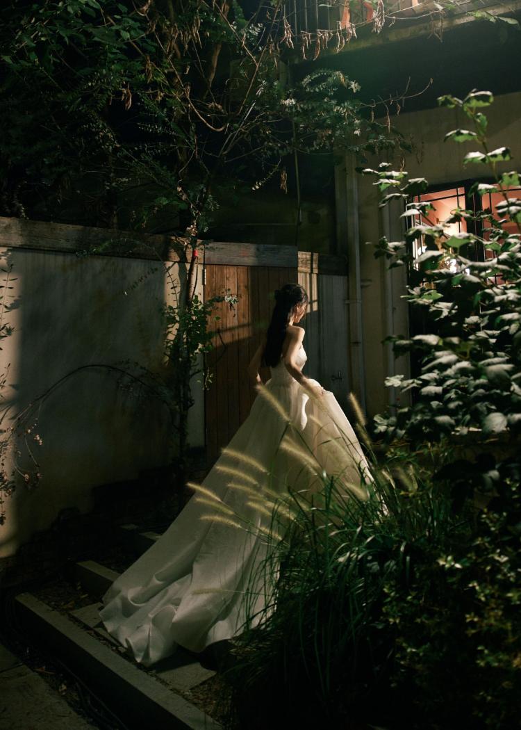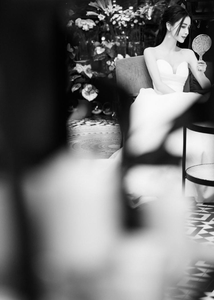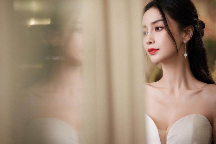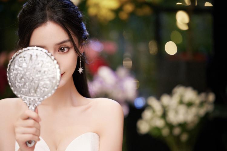 Angelababy工作室公开一组baby录制综艺的花絮照,照片里的她穿着白色抹胸纱裙,手拿复古小镜子,气质神秘优雅。