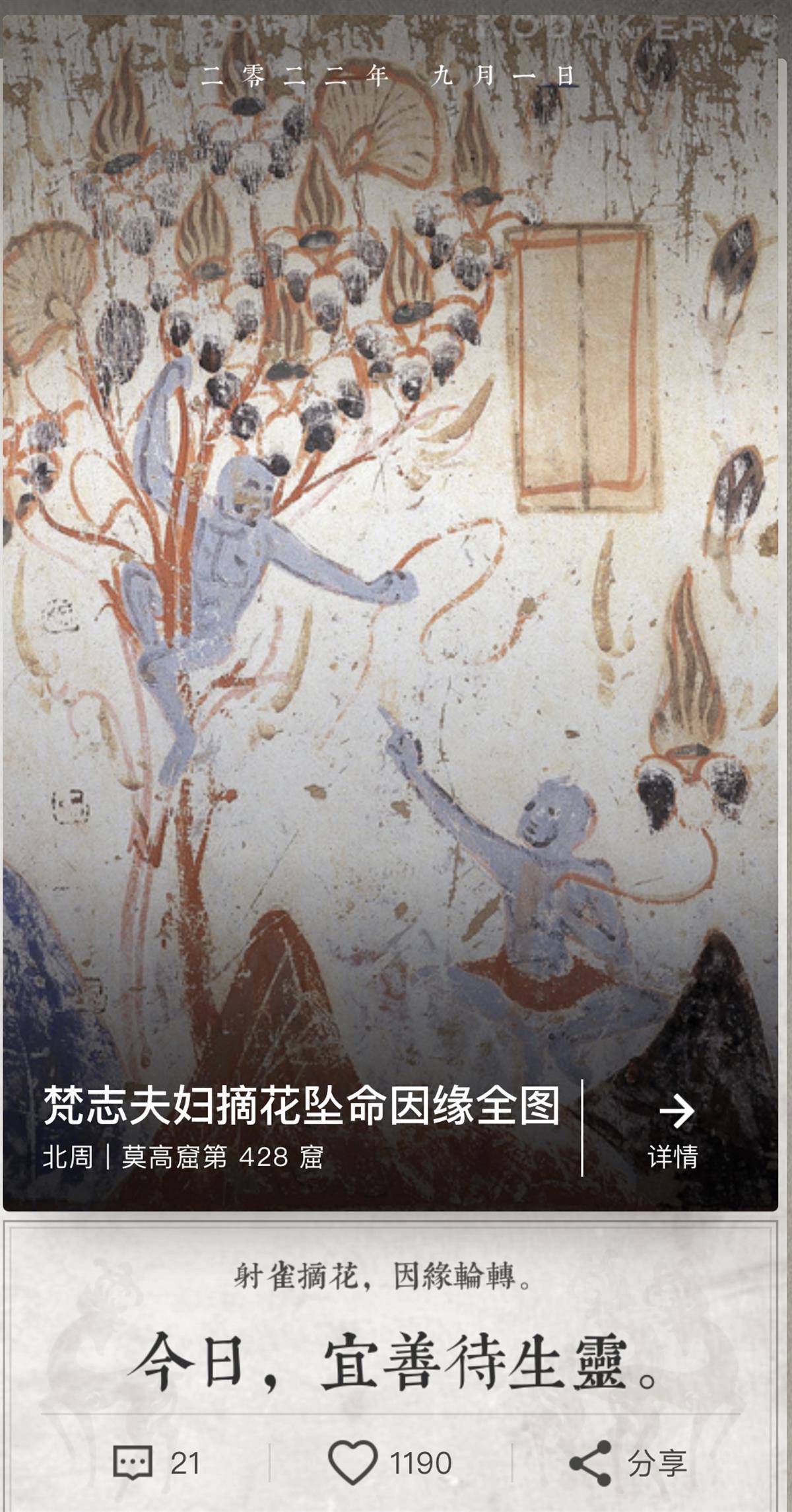 除了常规的全景浏览、视频介绍等功能,“云游敦煌”小程序还推出了一个最对年轻网友“胃口”的功能:每日专属卡片。卡片上集合了壁画、今日金句和网友名字、头像,方便大家在社交平台进行二次传播,完美融合了艺术与社交,无怪乎能俘获一大批年轻网友。