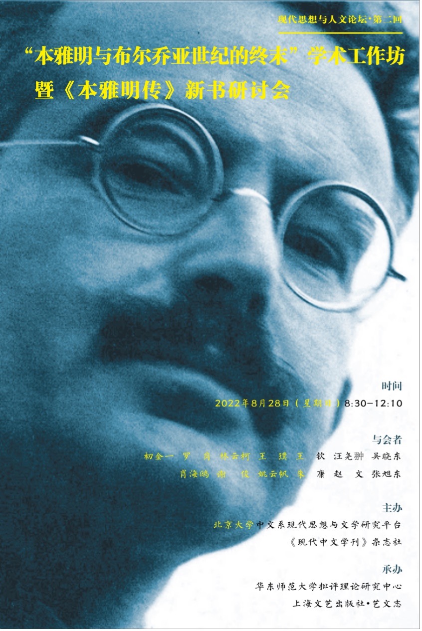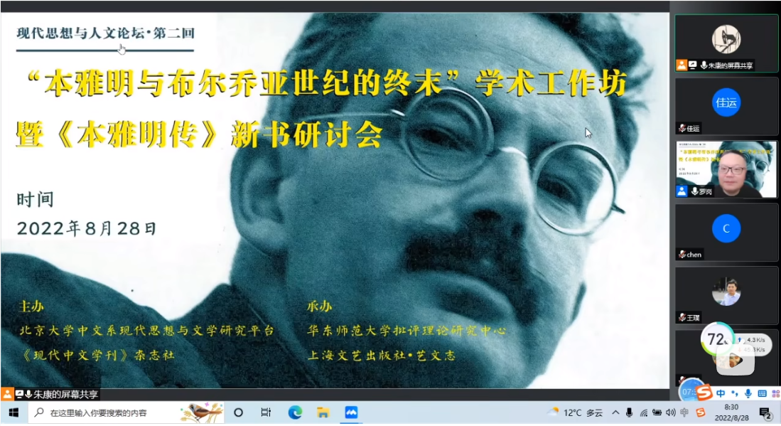 8月28日,由北京大学中文系现代思想与文学研究平台、《现代中文学刊》杂志社联合主办,华东师范大学批评理论研究中心、上海文艺出版社·艺文志共同承办的“本雅明与布尔乔亚世纪的终末”学术工作坊暨《本雅明传》新书研讨会在线上召开。来自北京大学、华东师范大学、纽约大学、东京大学等研究机构的共13位学者、专家、出版人共同参加了此次活动,华东师范大学中文系教授罗岗主持开幕式。