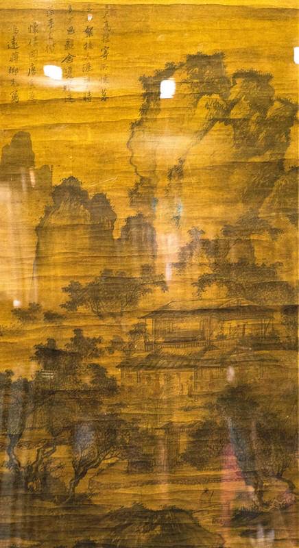 “明永乐·青花缠枝花卉葡萄纹海水折沿大盘,是永宣时期的经典样式。构图疏朗而饱满,笔触婉转流畅。唐伯虎绢本中堂‘怀楼图’,画幅的左上方有唐寅亲笔题画诗及款识:‘百尺高楼寄所怀,暮烟如絮接天涯。望时多有思亲念,泪眼迷茫手自揩。怀楼图,唐寅为鸣远蒋乡兄写’。”上海天物博物馆馆长、景德镇陶瓷大学御窑研究所所长钱伟鹏说,唐伯虎与沈周、文徵明、仇英合称“明四家”。擅长诗文书画,作品多以人物、花卉为主,山水画不多见。这件《怀楼图》是他为同乡蒋鸣远所作,描绘的是山水,且这么大篇幅,十分罕见,具有极高的收藏价值,“从诗文可以看出,画思亲念长之意,寄托了唐伯虎的淳朴情感,体现了唐寅绘画情景交融、诗画共汇的艺术风格。”