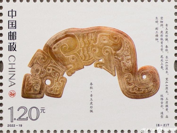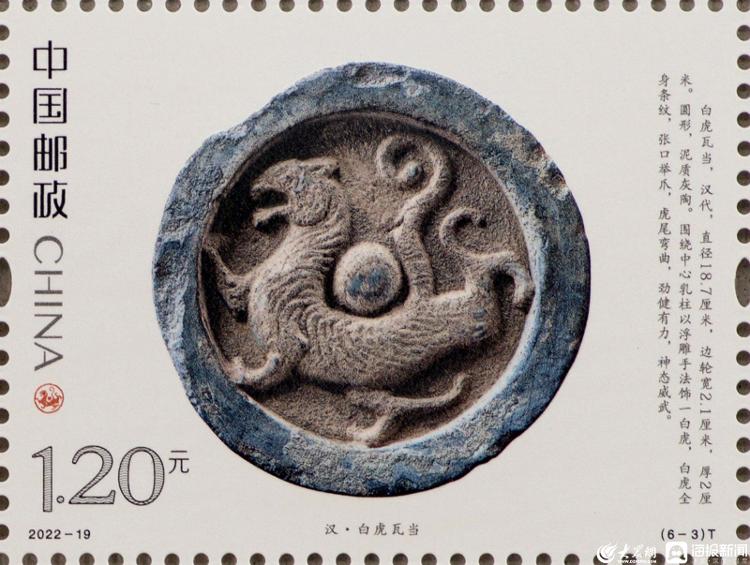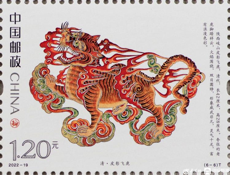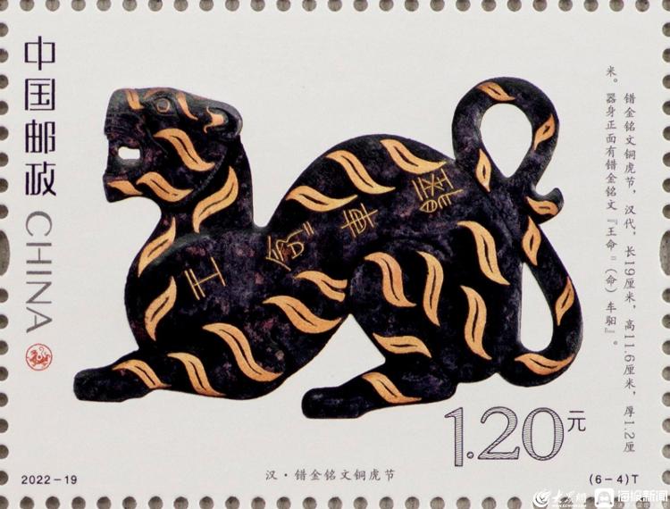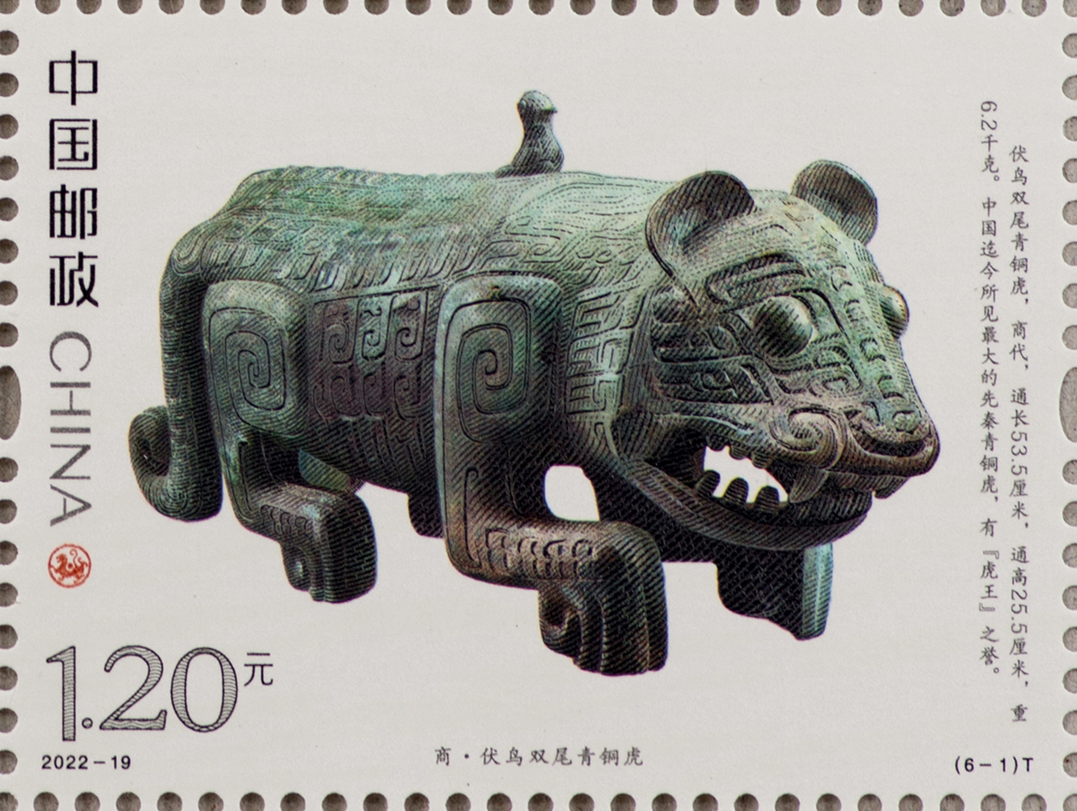 9月5日,中国邮政发行《虎(文物)》特种邮票一套6枚。邮票图案名称分别为:商·伏鸟双尾青铜虎、春秋·青玉虎形佩、汉·白虎瓦当、汉·错金铭文铜虎节、金·磁州窑白釉褐花卧虎枕、清·皮影飞虎。全套邮票面值为7.20元。