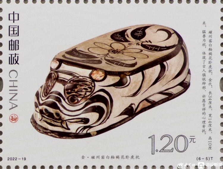 “金·磁州窑白釉褐花卧虎枕”,长34厘米,宽14厘米,高10厘米。猛虎为枕,体现了古人镇妖辟邪、祈愿吉祥的心理寄托。藏于周口市博物馆。