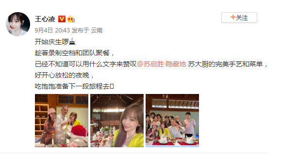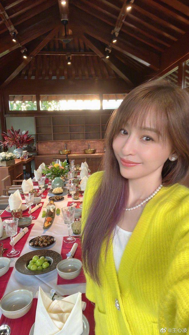 在王心凌发出的庆生微博中,她配文写道:“开始庆生啰,趁著录制空档和团队聚餐,已经不知道可以用什么文字来赞叹苏大厨的完美手艺和菜单,好开心放松的夜晚,吃饱饱准备下一段旅程去。”在晒出的照片中,王心凌身穿亮黄色针织衫,搭配珍珠项链,还有茶棕色的长发,整体穿搭很好地调和了甜美和熟女的气质。而她的拍摄角度,还是经典的微侧颜微笑自拍,看起来与她刚出道之时并无二致,不愧是“冻龄女神”。