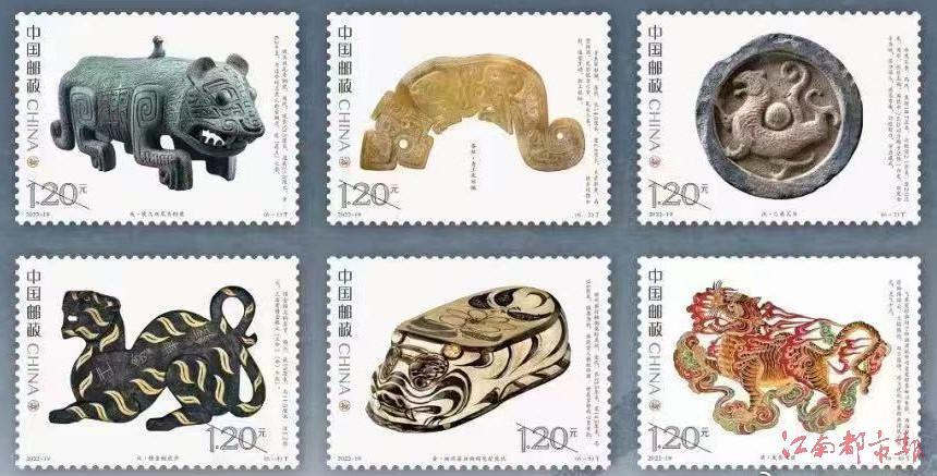 据了解,一套特种邮票共6枚。邮票图案名称分别为商·伏鸟双尾青铜虎、春秋·青玉虎形佩、汉·白虎瓦当、汉·错金铭文铜虎节、金·磁州窑白釉褐花卧虎枕、清·皮影飞虎。邮票底图采用多种专色印制,底纹运用老虎独特的元素。活动现场,该套邮票和第一枚邮票原型——商代青铜艺术的辉煌之作“商代伏鸟双尾青铜虎”同馆展出。