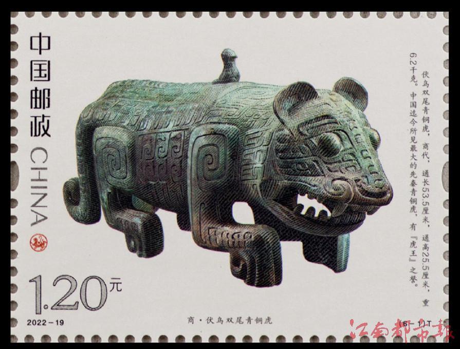 这只先秦时期青铜虎造型奇特,外表威武、勇猛的神情,形象生动,将虎的神性和人对虎的崇尚之情表现到极致,是商代青铜艺术的辉煌之作。随着《虎(文物)》特种邮票的发行,这只来自三千多年前江西省新干县大洋洲的青铜虎也首次登上“国家名片”,重新点燃了修复历史记忆的火种,也扛起了传承“赣文化”的旌旗。