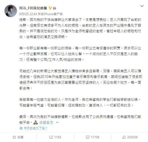 阿沁5日深夜在微博改口道歉,称措辞不当让大家误会,他只是想告诉大家艺人台前光鲜,背后其实有很多为人所不知的牺牲,称“台前的艺人在资本的产业链中是处于弱势的”,并称“并不是说他(林彦俊)做的对”。