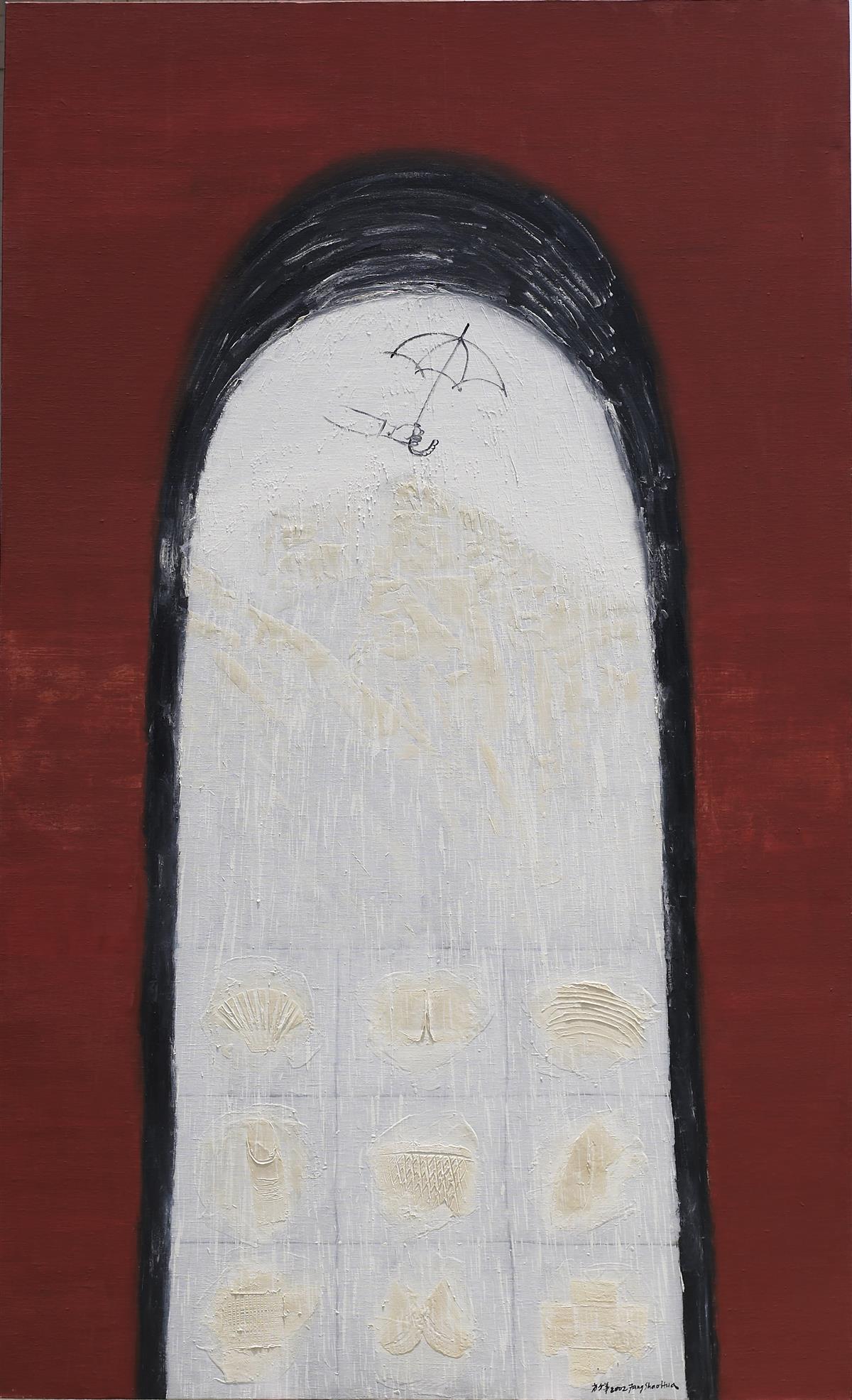 在《喜马拉雅的紫外线强度》《喜马拉雅的能见度》中,观众一眼便能发现一把在多个作品中反复出现的“小雨伞”。“我曾持续用这把雨伞作为我的一个符号。春天的广州,常下雨,这是我躲雨的工具,伞下也有一个小乾坤。”方少华介绍。