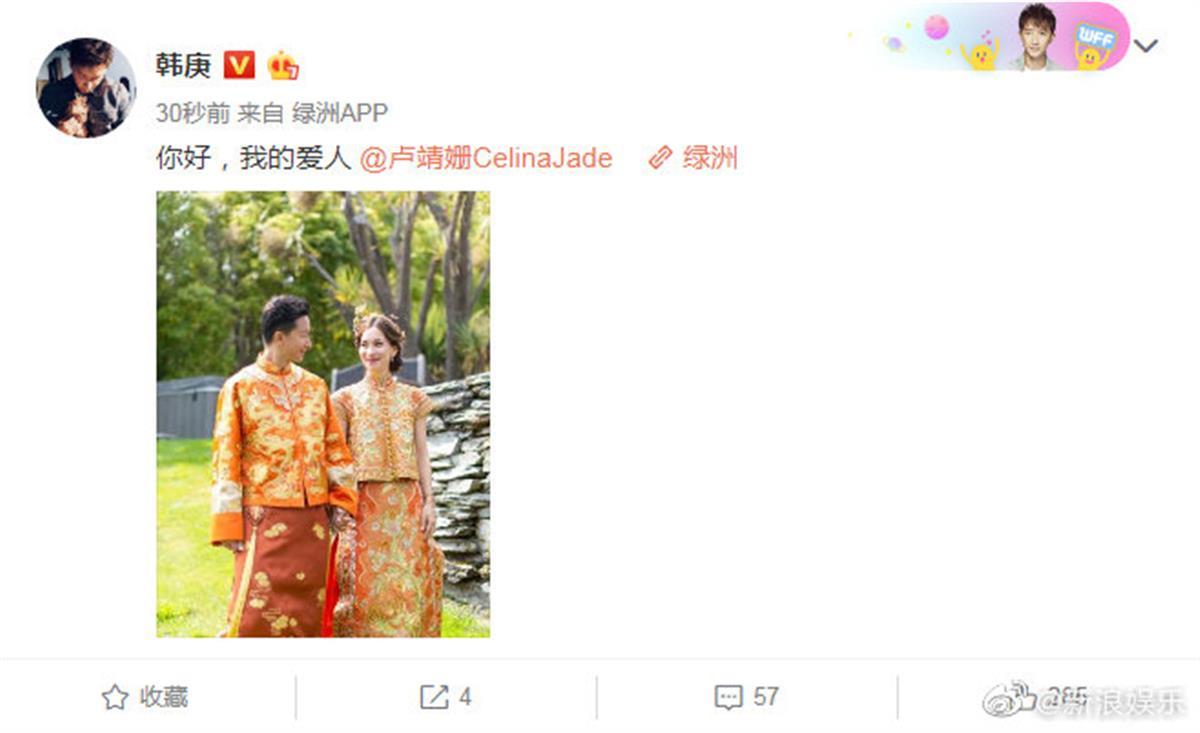 2019年12月31日,韩庚、卢靖姗以“你好,我的爱人”为题,发文官宣结婚喜讯,同日,两人在新西兰举行婚礼。
