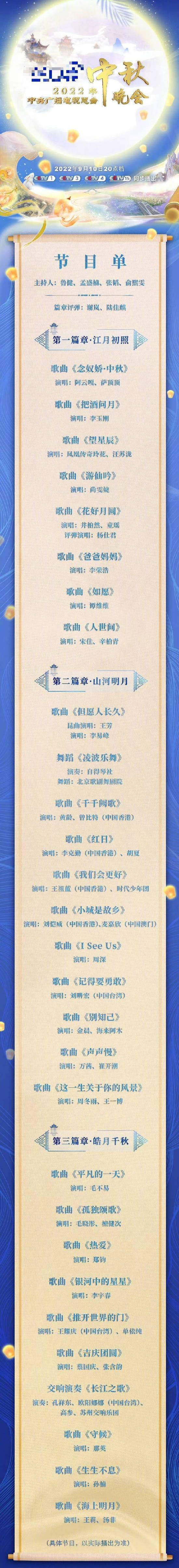 搜狐娱乐消息,9月10日,央视中秋晚会节目单官宣,晚会由鲁健、孟盛楠、张韬、俞熙雯担任主持人,分为《江月初照》《山河明月》《皓月千秋》三个篇章,刘畊宏、那英、周深、周冬雨等一众明星将登台演出,于今晚20点播出。