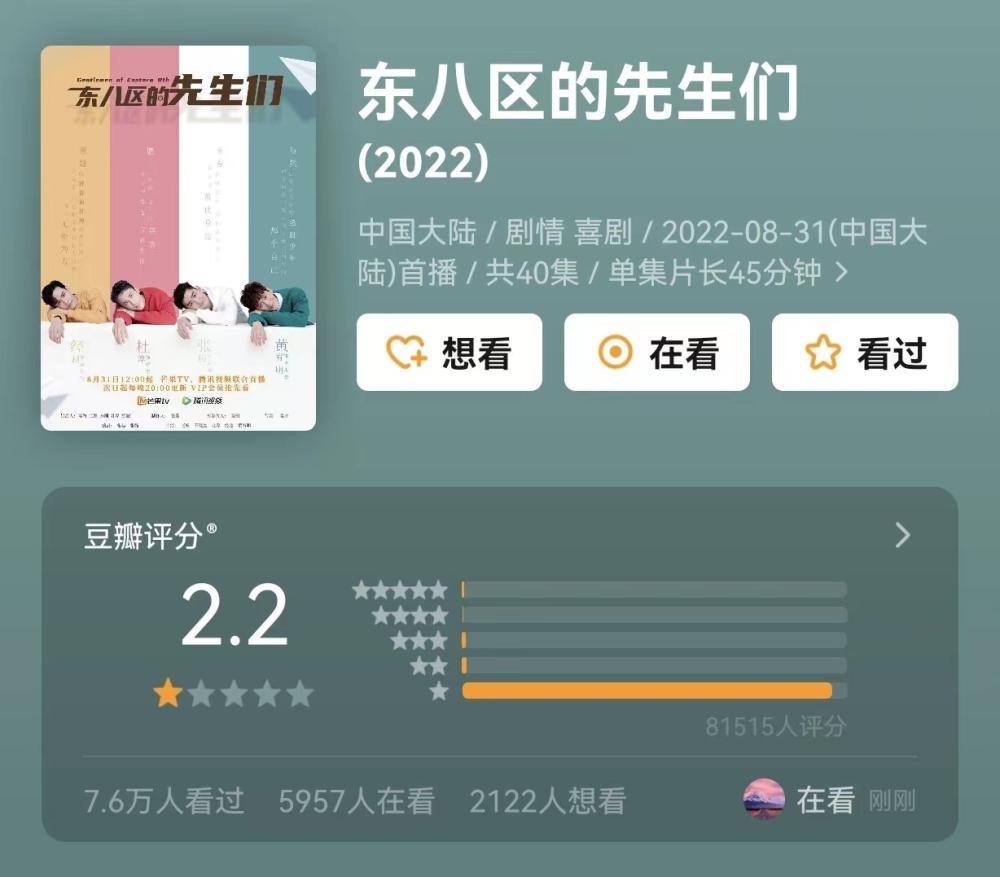 9月13日,“东八区的先生们 上星剧”登上微博热搜,该剧除在网络平台播出外还在湖北卫视播出,这也引发许多网友不满:最近很多7、8分的好剧都没有上星机会,2分的烂剧为何能够上星?