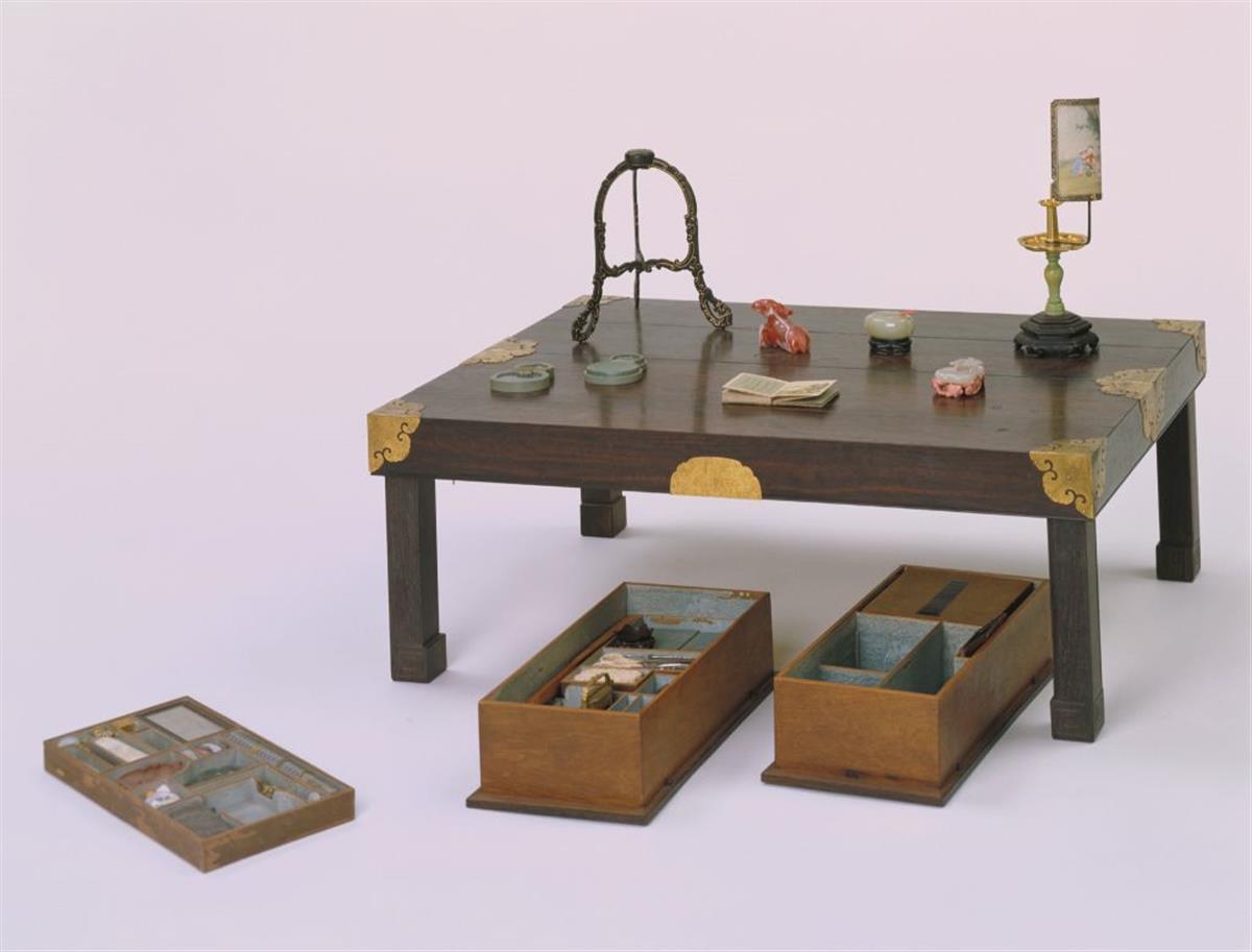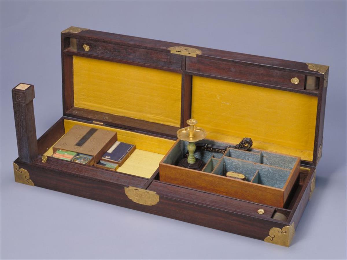 这个文具箱由紫檀木制成,合闭为箱,折叠展开则为桌,设计极为巧妙,适宜外出旅行使用。文具箱盖装有镀金暗锁,打开后成长方形小桌,把箱盖、箱底合拢后便成了桌面,桌腿则设计在箱槽内,用活动薄板作支撑,再用铜鎏金暗扣固定。
