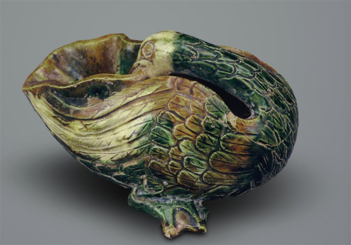 同样由武汉博物馆珍藏的三彩鸭形水盂,也是人气较高的文具类文物。水盂,是洗笔用的文房用具,这件三彩鸭形水盂通体施深绿及深、浅黄釉,浓淡相间,绚丽多彩,造型别致生动,是仿生陶器中的杰作。
