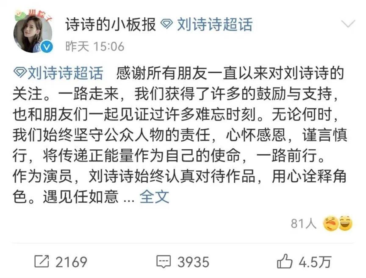 9月15日,刘诗诗工作室针对此事发文回应,表示工作室的初衷始终如一,“作为工作室,诗诗的角色与作品,始终是我们最珍视的部分,也永远是我们最坚守的底线。我们会谨慎遵守基本原则处理工作,坚决维护刘诗诗本人利益,会以刘诗诗的事业发展为考量采纳大家的合理建议,请大家给予信任。”