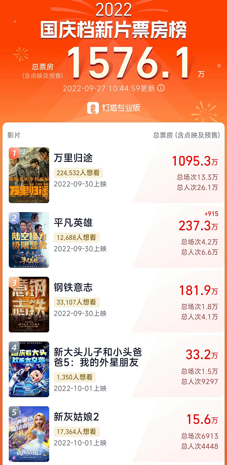 截至上游新闻记者发稿时止,国庆档新片票房榜已经突破1500万,《万里归途》以1093万的点映和预售领跑。