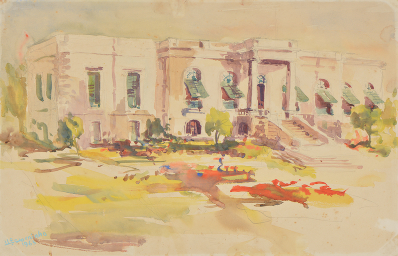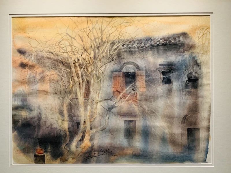 郑家大屋是中国近代著名思想家郑观应家族的故居,其建造年份可追溯至1869年,是一座院落式大宅。大屋虽主要以中国岭南建筑之形制构建,但别具特色,其室内天花泥塑图案、门楣和窗楣的式样,以及外墙之抹灰等细节均体现出受到西方建筑文化的影响。展览展出的一幅画,以湿写法为主体,用黑色、深蓝色及褐色大笔擦出房子外墙因雨水而留下的霉痕;用红棕色描摹可根据光线来调校活动窗叶的木制“百叶窗”,画出了郑家大屋的沧桑感。