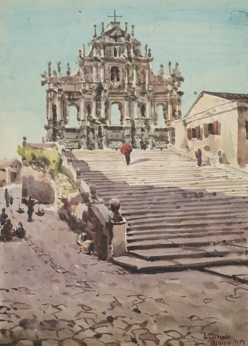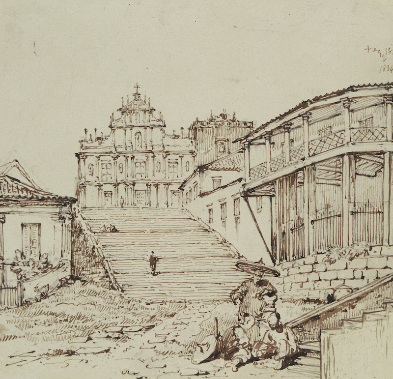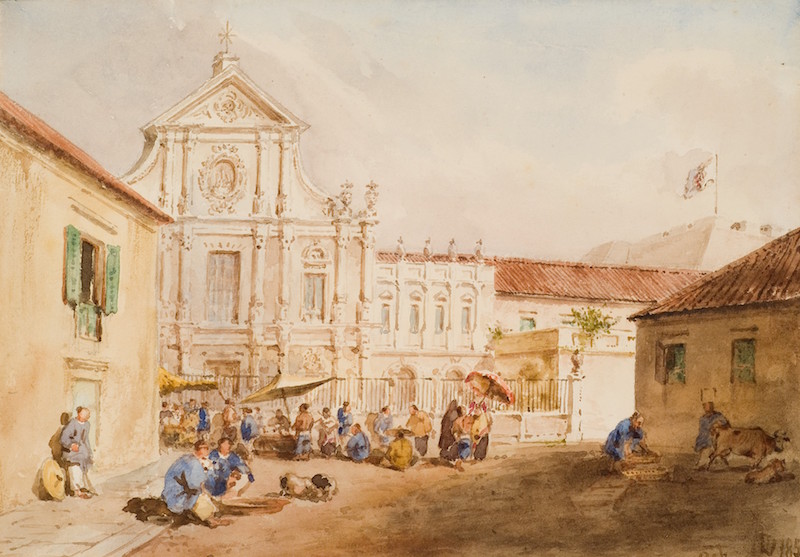 大三巴牌坊是天主之母教堂(即圣保禄教堂)正面前壁的遗址。教堂附属于圣保禄学院,该学院于1594年成立,1762年关闭。1835年一场大火烧毁了圣保禄学院大部分建筑,仅剩下教堂的正面前壁、部分地基、围墙以及教堂前的石阶。下面这件作品表现了教堂、学院和图书馆于1835年1月26日大火前三个月的视觉形象,让人以艺术世界里的圣保禄教堂去想象19世纪的澳门一隅。