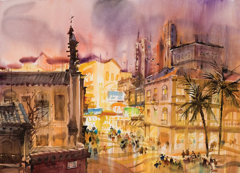 进入到当下,展览中的一件画作以水彩为媒介,表现澳门市区夜间景致。画中地点是有典型南欧氛围且人气甚旺的板樟堂前地一带。画家以紫色画夜空,再用浅黄画出建筑物和葡式碎石路的底色,以及附近拱廊式建筑的商店外墙等,营造出过人的视觉冲击力和感染力,表现出这处公共空间灯火辉煌、行人熙来攘往的景象。