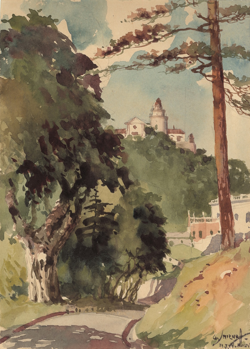 另有一件画作以些微仰视的角度描画天主之母教堂遗址。前景是碎石路,旁边的房子因为日照的关系而于其上留下影子。太阳照耀下的石台阶和牌坊在湛蓝的天空的映衬下显得亮丽怡人,折射出这一宗教处所曾经的辉煌。耶稣会纪念广场位于大三巴石阶的延伸区域,街面铺设葡式碎石路面,广场以纪念耶稣会为澳门所作出的贡献而命名。