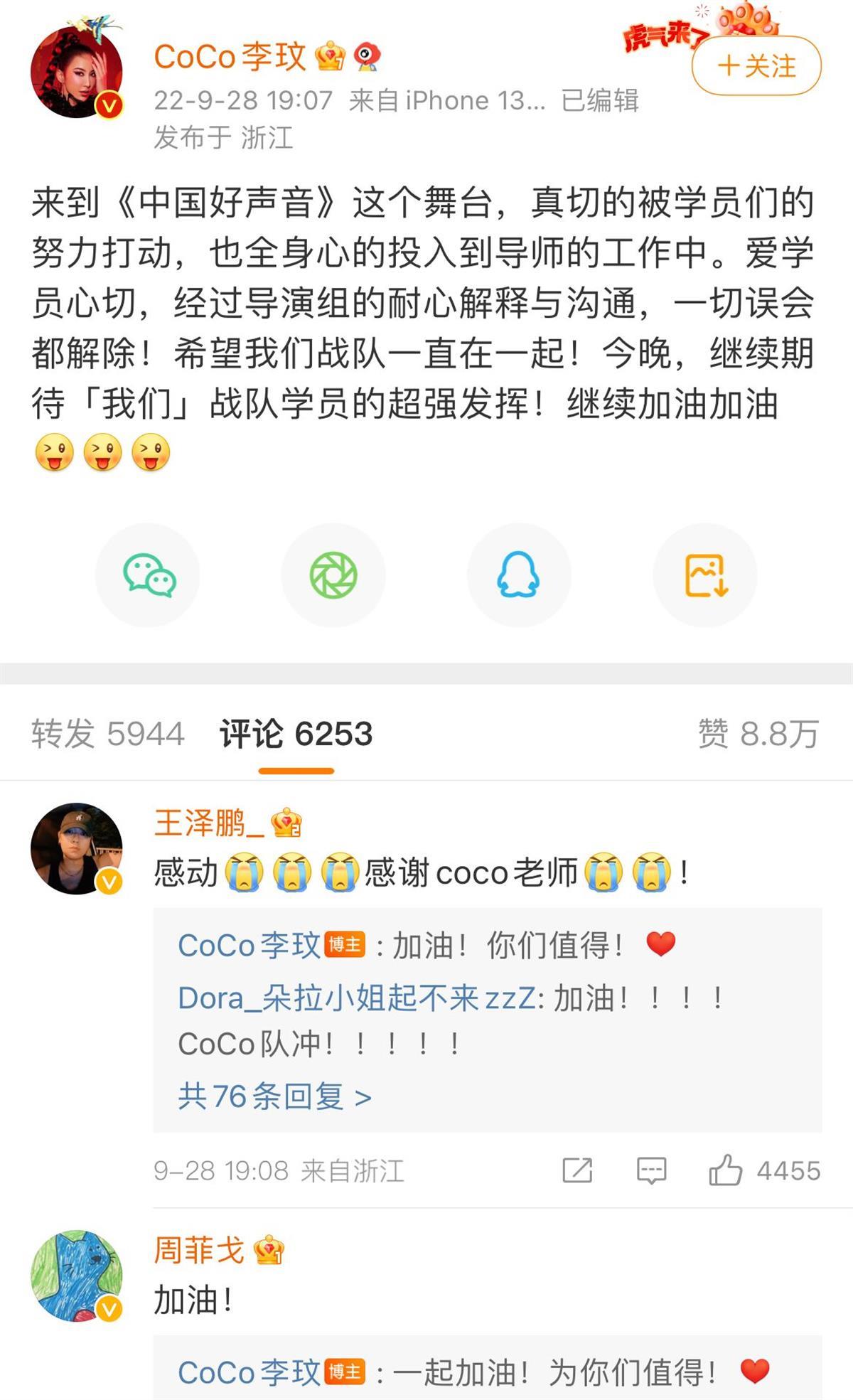 28日晚,李玟在微博回应风波,表示“一切误会都已解除”。文中她提到,来到《中国好声音》这个舞台,真切地被学员们的努力打动,也全身心地投入到导师的工作中,“爱学员心切,经过导演组的耐心解释与沟通,一切误会都解除!希望我们战队一直在一起!”而李玟战队的学员王泽鹏和周菲戈也在评论中表示:感谢coco老师,加油!