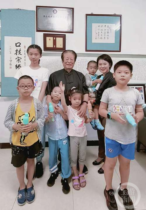 ▲ 牛玉亮与张建平与参加口技非遗夏令营的孩子们在一起。图片来源/受访者供图