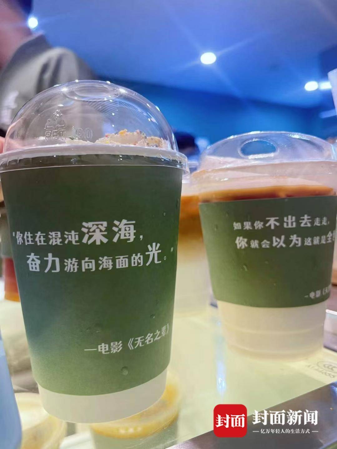 封面新闻记者看到,太平洋影院的文创奶茶菜单上,都是与公路电影相结合的“电影奶茶”。取名来源电影《千与千寻》《夏日么么茶》《非诚勿扰》《爱丽丝梦游仙境》与《白日梦想家》等,茶杯身上的经典电影台词也让不少消费者产生了情感共鸣。