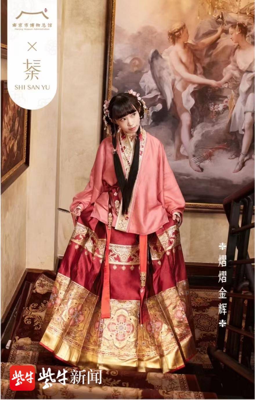 这款包包也成为网友的热门“复原款”。设想一下,背着这款时尚的明朝贵妇包,该搭配什么衣服呢?南京市博物总馆携手知名国风品牌推出的联名华服,就将帮你解决这问题。搭配汉服“熠熠金辉”闪耀着大明少女的贵气,上衣是暗纹提花面料,凑近看玫粉暗纹很漂亮,阳光下还有光泽,领子上的刺绣很密实,有一种珠宝散落在花丛中的感觉。下面搭配圆扁金并用的织金马面裙,根据莲纹金盒创作的纹样,在裙摆展开,转动起来,仿佛大明的贵气呈现在我们眼前,从色彩纹样到工艺都富贵感拉满,售价在400多元。
