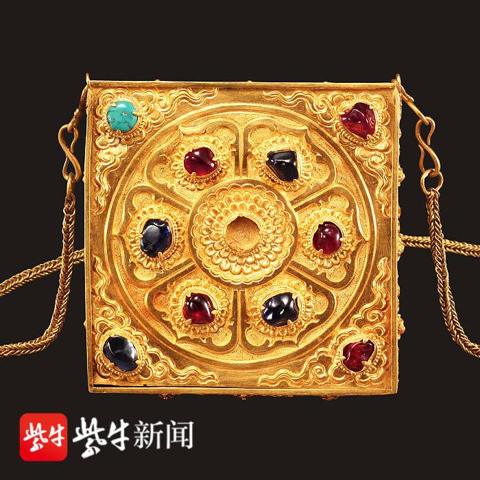 这件黄金方形链条包高1.7cm,边长8.5cm,相当于现在的零钱包大小,可以抽拉打开。盒面是用黄金制作的凸起莲花、如意云纹,立体感十足,在莲花纹的中心还镶嵌有各种有色宝石,在侧面装饰的是缠枝莲纹,就连底部都是以如意云纹作为装饰,并在中心配以圆形的梵文六字箴言,一切都是以宗教艺术为设计主题,带有浓厚的宗教文化特色。历经600年依然熠熠生辉,唯一遗憾的是中间的宝石遗失不见。目前,有专家研究认为,里面可能曾装着微缩版的佛经。