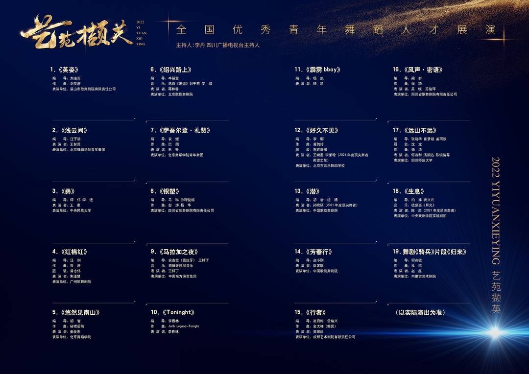 据悉,该展演由中央宣传部文艺局、中国文联国内联络部、中国舞蹈家协会、中共四川省委宣传部主办,由中国文联舞蹈艺术中心、四川省文化和旅游厅、四川省文学艺术界联合会承办。届时,来自全国各大艺术院校、演艺团队的青年舞蹈家将强强联手,给观众带来视听双绝的震撼感受,唤醒沉睡的舞蹈基因。