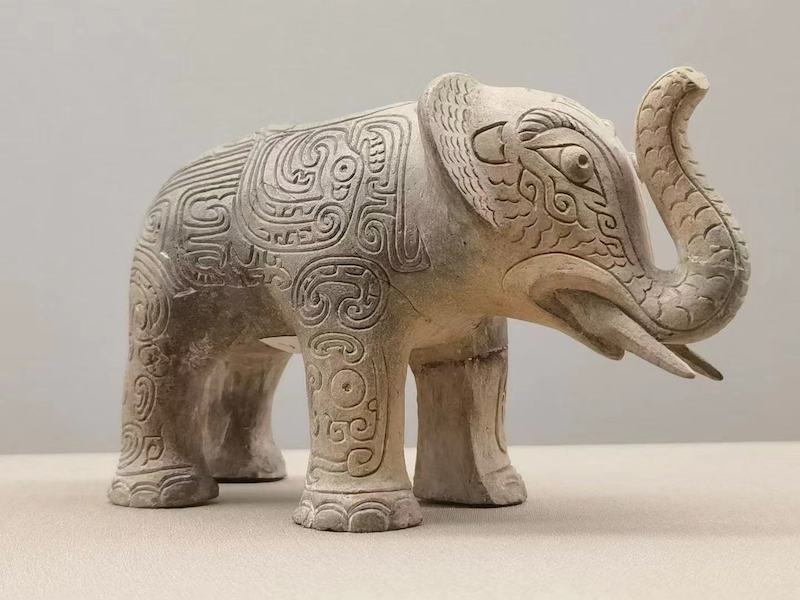 河南新乡曾出土了一个商代白陶象尊,高8.8厘米,象身通体布满纹饰,玲珑可爱。象尊是商周时祭祀活动中使用的盛酒礼器之一,材质虽为白陶,但造型和纹饰深受同时期青铜器的影响,具有较高的艺术价值。此象尊的主体部位饰有凤鸟纹、夔龙纹,鼻、耳上饰鳞纹,额上有蛇纹,纹样均呈浮雕式。