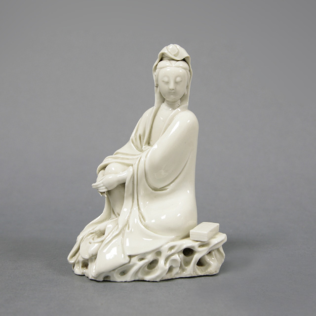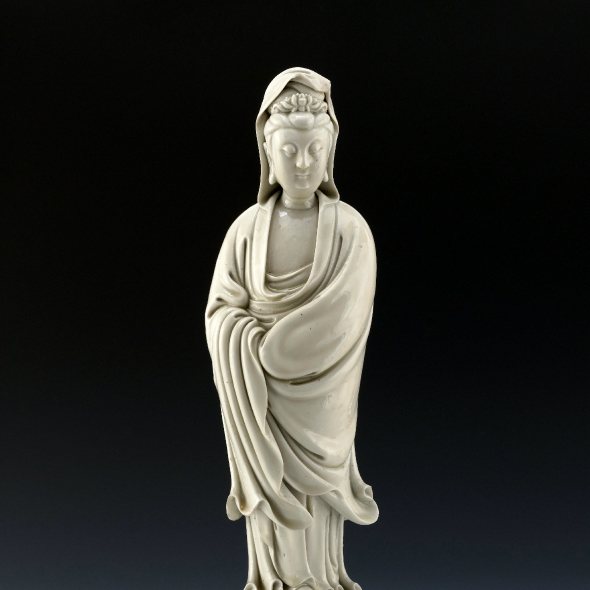 明代德化窑还突破了器物的实用功能,开创出一种更具创造力的艺术门类——瓷塑,白瓷观音像便是其中最受欢迎的产品。德化窑烧制的白瓷塑像除了观音以外,还有弥勒、达摩、文昌、妈祖等造像,人物神态雕刻精细,衣物的刻画具有流动的飘逸感,显得造像超凡脱俗、气韵雍容。