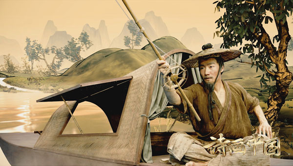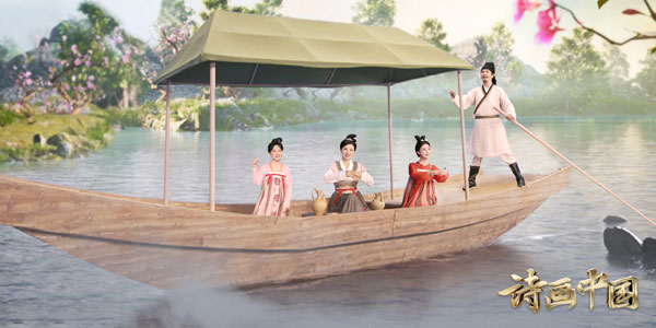 本期《诗画中国》的舞台上还将展示一幅我国现存的历史最久远的青绿山水画卷——隋代展子虔的《游春图》卷。画卷以全景方式通过对“滩涂策马”“湖畔分别”“主仆渡桥”“驻足观澜”“仕女泛舟”等主题场景的描绘,展示出一幅春光明媚、游人踏春赏玩的春日景象。张晓龙饰演艄公,薛佳凝、斓曦、阿兰·达瓦卓玛分饰泛舟仕女,生动演绎出了古人在春日山水中纵情游乐的怡然姿态。