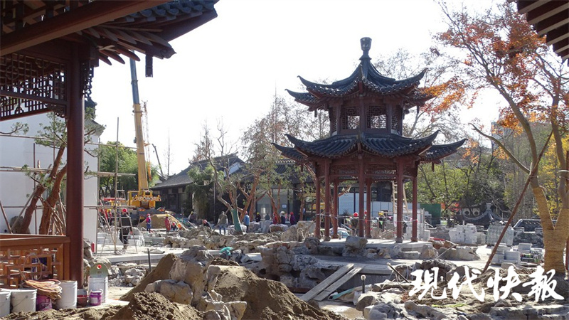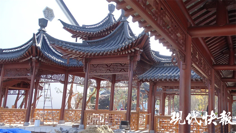 在施工现场记者看到,文汇阁亭廊建设快速推进,目前已经基本成形,整体展现,正在进行最后油漆等工序。