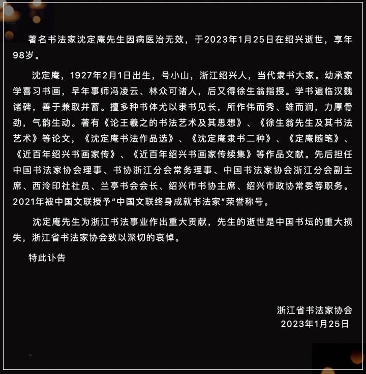 1月26日,天目新闻记者从浙江省书法家协会获悉,著名书法家沈定庵因病医治无效,于2023年1月25日在绍兴逝世,享年98岁。