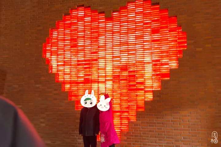 场馆内人气最高的,当属这一堵明亮炽热的爱心红墙。红心墙旁围满了前来“心”地标打卡的游客,拍照的小情侣、闺蜜、夫妻络绎不绝。周小柚在当天还看到了多对特意来此拍摄的新婚夫妇。