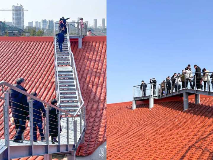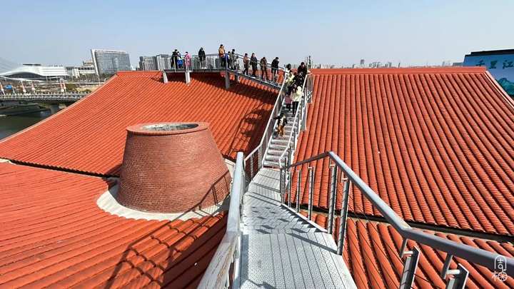 参观完礼堂一层大厅,从侧面楼梯一直向上走,便可通往屋顶的观景栈道,也就是我们所说的“上房揭瓦”啦!