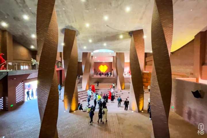 走进礼堂,穿过屏风墙,下沉式广场便瞬间豁然开朗。整个空间穹顶极高,有8只艺术螺旋柱立于其中……立体多变的空间构造引人打卡。不知道是不是设计师的别有用心,整个空间的构造设计与衢州龙游石窟也颇有几分相似。