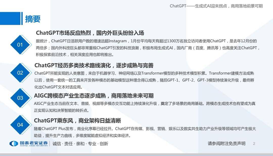 其实,ChatGPT+娱乐,人机互动加强,激发用户参与热情,ChatGPT可以成为线上实时聊天对象,增加互动的趣味性和娱乐性,这只是ChatGPT商业化蓝图里的一部分。记者从国泰君安证券研究所进行的行业研究专题了解到,随着商业化序幕拉开,ChatGPT将在传媒、影视、金融、教育、医疗等众多领域赋能,但合规性问题和技术性问题也亟待解决。