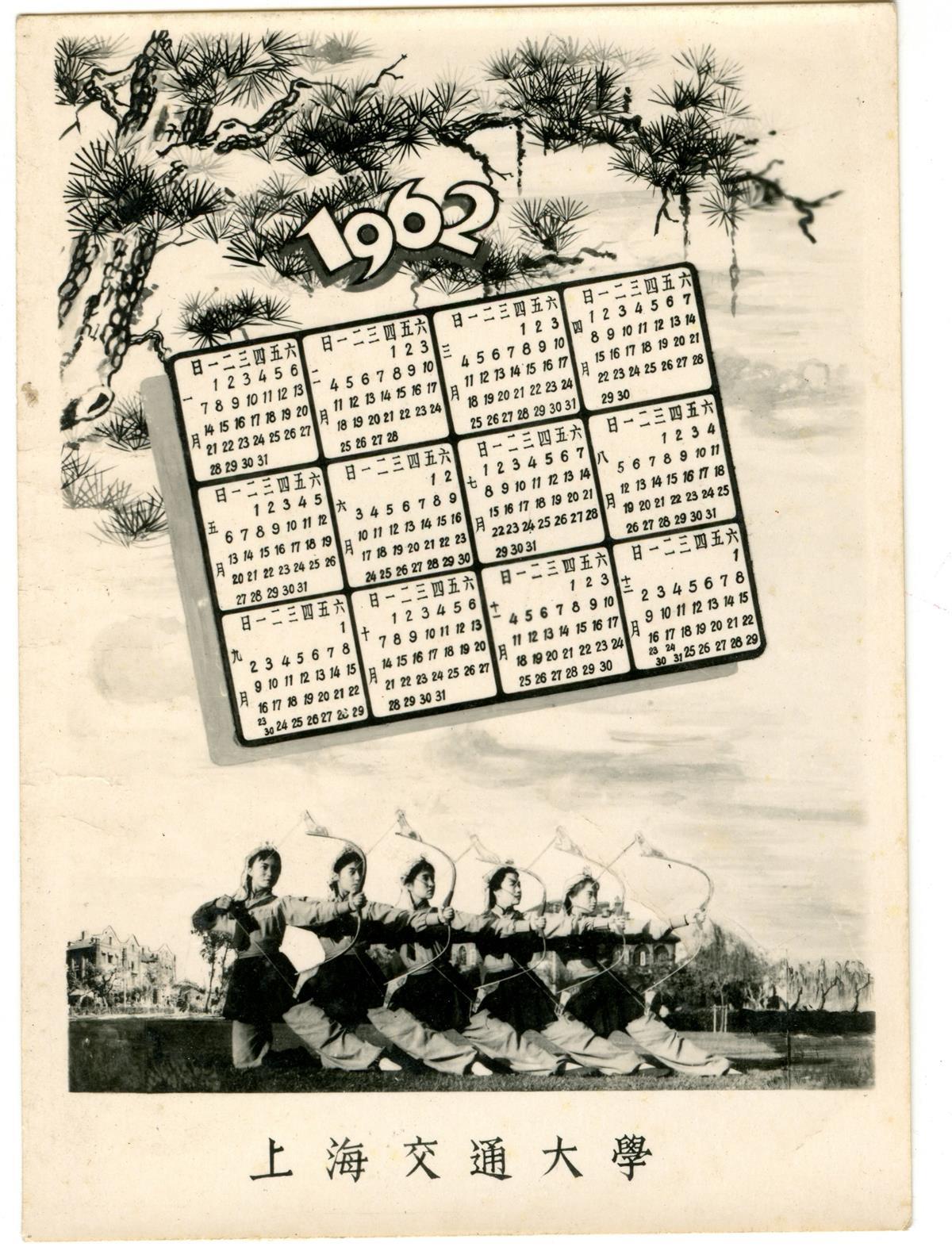 五位青年身着民族服装,并排张弓射箭,配发1962年的新年日历,这是上海交通大学1962年的贺年片。