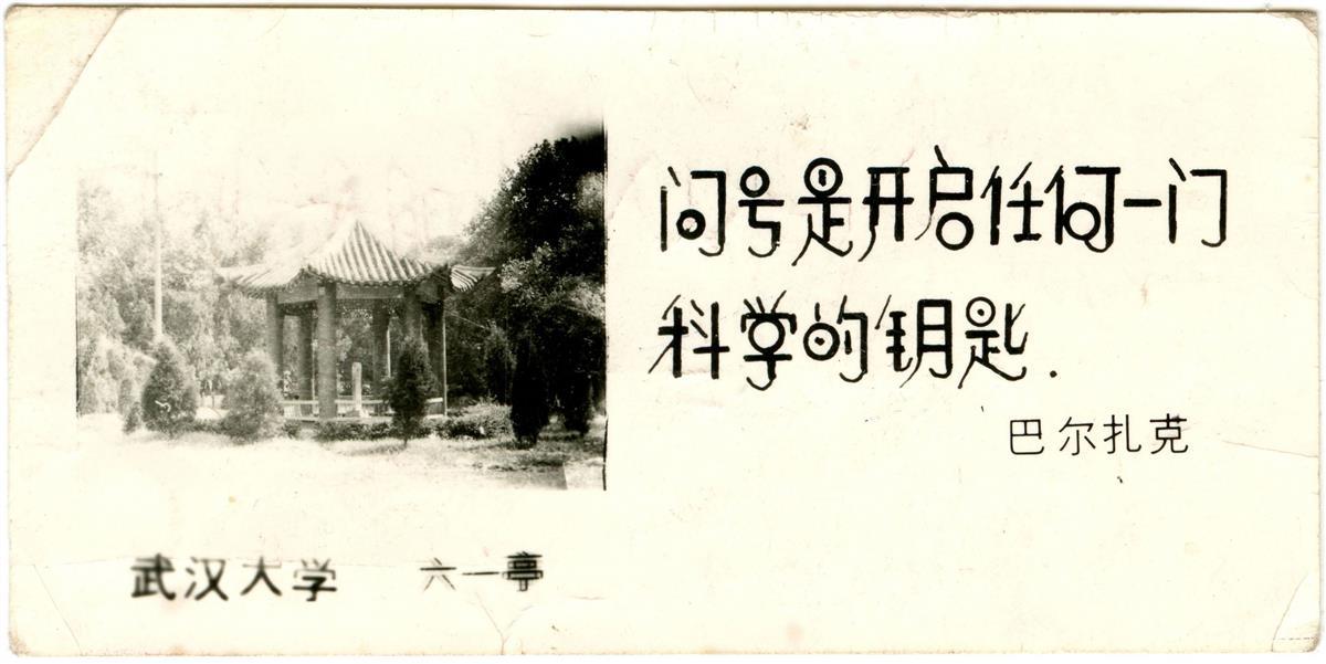 “问号是开启任何一门科学的钥匙。巴尔扎克。”文字旁配发武汉大学六一亭的照片,这是武汉大学上个世纪的贺年片。