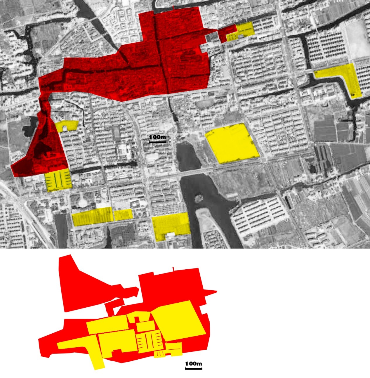 上图红色区域为西塘古镇景区范围,黄色区域为周边停车场区域。下图为红色区域与黄色区域的面积对比图——几个停车场的总面积几乎占了景区面积的一半。制图:赵忞 底图来源:百度地图