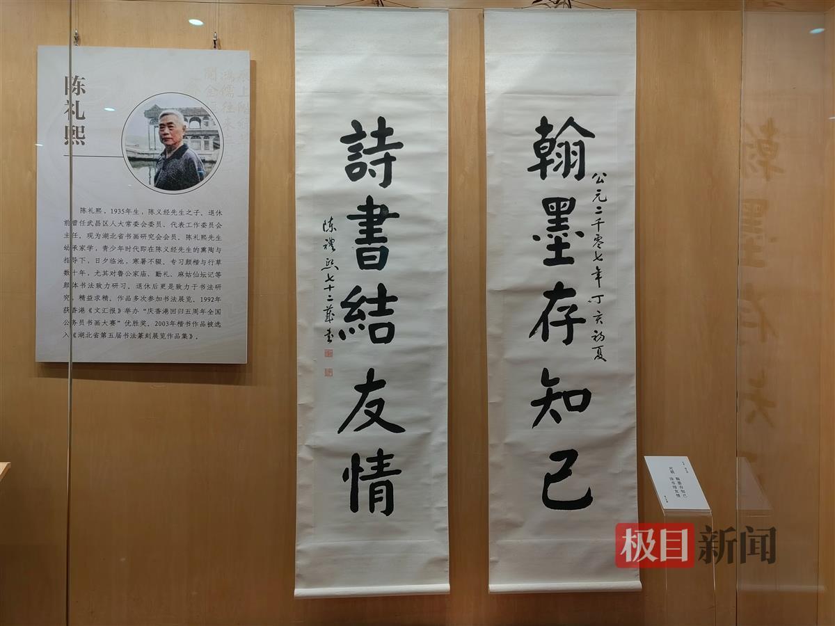 本次展览共展出陈氏三代人60余幅书法佳作,如陈义经的《黄鹂绕碧树 金菊对芙蓉》对联等。陈义经之子陈礼熙、陈义经之外孙陈言兴两位后人,分别在不同程度上继承和发扬了“金刚陈体”的艺术精髓和风格特点,创作出许多具有时代意义的作品。当日还展出了陈礼熙的《翰墨存知己 诗书结友情》对联、陈言兴《高山流水》琴铭等,书法与古琴相得益彰。从展览中,可以看到陈氏书法的传承有序,可以感悟中国书法艺术的魅力。